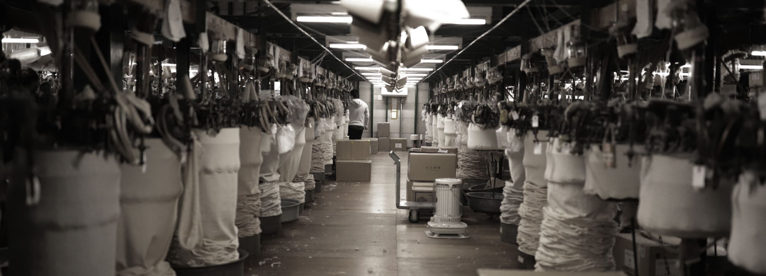 Our heavyweight series jerseys are knitted on a Standwheeler, a specially-designed vintage circular knitting machine created in Wakayama. Spun from No. 8 yarn, our jersey fabric is twice as thick as yarn from standard machines—and thus, can only be knit by Standwheelers. Today, only a handful of these rare machines are in operation, handled by an even smaller number of craftsmen.