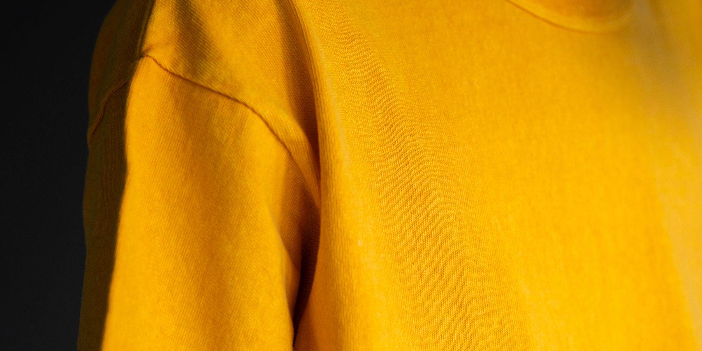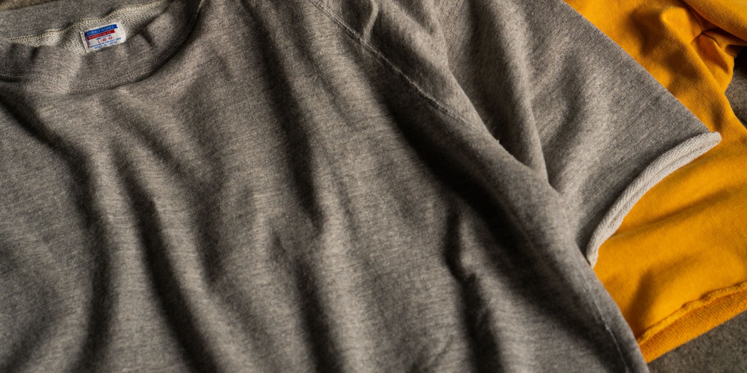 落ち綿天竺のボディは、和歌山にある老舗カットソーメーカーの、ヴィンテージの丸編み機によって編まれています。通常の高速シンカー編み機と違って生産効率はよくありませんが、スラブ糸のラフィのムラ感を活かした、ヴィンテージ感ある味わい豊かな生地ができあがります。