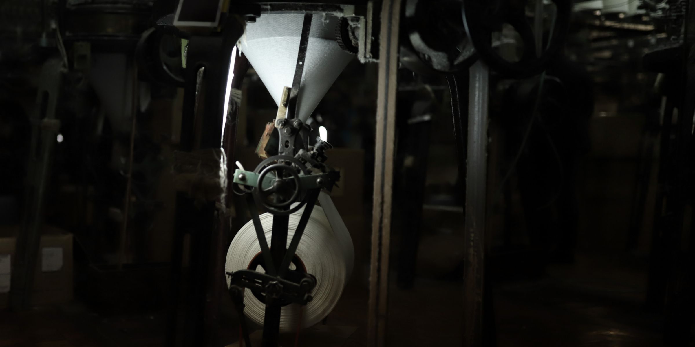 スウェットを編む吊り編み機は、世界的に見ても和歌山でしか稼働していない、非常に希少な編み機です。日本の数少ない熟練の職人による、丹念なメンテナンスによって残ってきた編み機で、扱える職人も多くありません。現代の高速編み機と違い、生産に非常に時間を要しますが、風合いがよく、柔らかで着心地のいいボディに仕上がります。